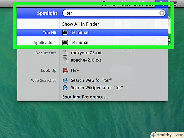 Відкрийте термінал. Натисніть Spotlight, введіть термінал і двічі клацніть по «Термінал»