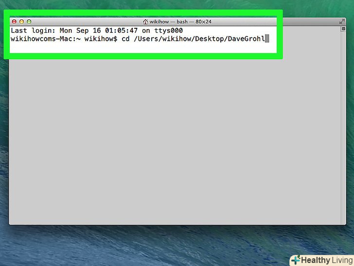 Перейдіть до каталогу DaveGrohl. введіть cd , один раз натисніть на пробіл, а потім натисніть ⌘ Command + V , щоб вставити шлях до папки DaveGrohl. Так в терміналі ви перейдете в каталог davegrohl.
