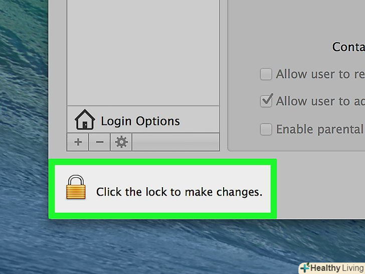 Розблокуйте меню. натисніть на значок у вигляді замка в нижньому лівому кутку екрану, а потім введіть ім'я адміністратора (якщо ви використовували метод злому High Sierra, введіть root ) і пароль (якщо ви використовували метод злому High Sierra, клацніть по рядку «Пароль» і нічого не вводите). Тепер натисніть ⏎ Return .