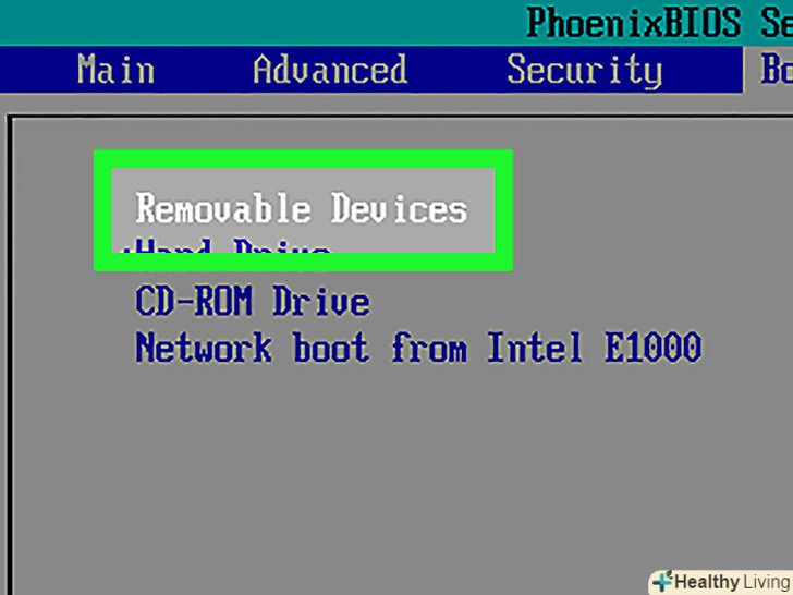Змініть основний завантажувальний пристрій на інсталяційний диск/накопичувач. ваші дії будуть залежати від версії BIOS; як правило, за допомогою клавіш зі стрілками потрібно перейти на вкладку " Boot "(завантаження) або " Advanced "(Додаткові), вибрати опцію " DVD " або "USB", а потім натиснути клавішу + , щоб перемістити диск/накопичувач в початок списку.- Якщо у вас виникли проблеми, пошукайте їх рішення в інструкції до BIOS.