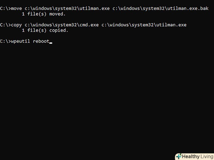 Замініть Диспетчер утиліт командним рядком. зробіть це, щоб отримати доступ до командного рядка на екрані входу в систему:- Введіть move c:\windows\system32\utilman.exe c:\windows\system32\utilman.exe.bak