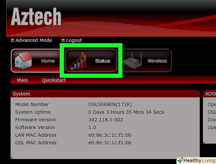 НатиснітьStatus (стан). ця кнопка розташована на панелі навігації.- Можливо, ця кнопка буде називатися «Advanced» (додатково) або якось схоже.