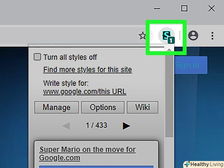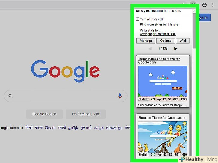 Натисніть на ескіз, щоб вибрати стиль. виберіть стиль, на якому відображається веб-сайт Google. Стиль буде застосований до сайту Google.com.- Далі ми будемо користуватися стилем «Super Mario on the Move», який знаходиться вгорі списку стилів.