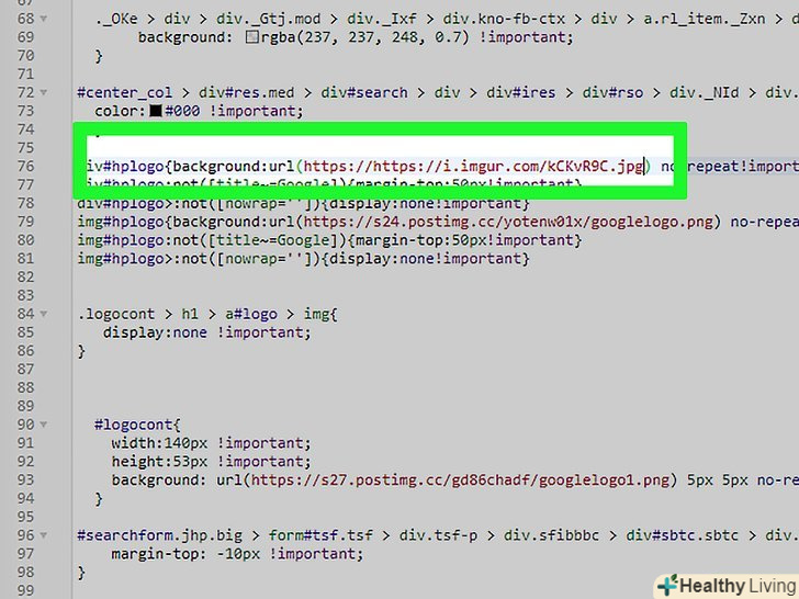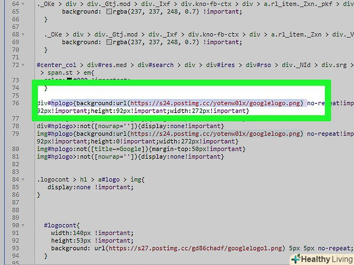 Знайдіть рядок коду, в якому згадується файл логотипу. у ній знаходиться повний шлях до файлу логотипу в мережі. Як правило, шлях закінчується на".png "і десь в ньому є слово" logo "(логотип). [5]- Якщо Ви користуєтеся стилем «Super Mario on the Move», шлях до файлу логотипу буде таким: "https://s24.postimg.cc/yotenw01x/googlelogo.png". щоб швидко знайти його, в рядку пошуку введіть "hplogo".