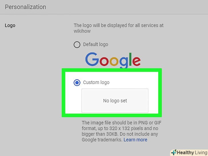 ВідкрийтеКонсоль адміністратора Google . якщо ви адміністратор G Suite, змініть логотип Google на своє ім'я, логотип компанії або інше зображення. Спочатку авторизуйтесь за допомогою облікового запису адміністратора і пароля. [1]- Розмір логотипу не повинен перевищувати 320 x 132 пікселя. Файл потрібно зберегти у форматі PNG або GIF, а максимальний розмір файлу — 30 КБ.