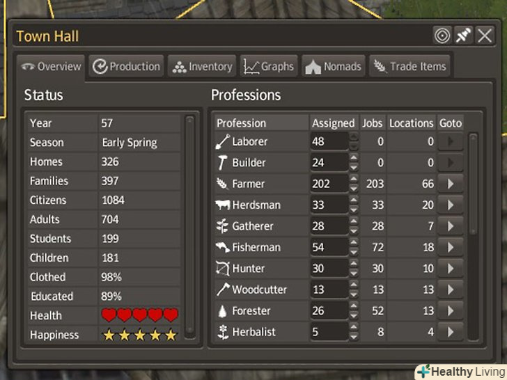 Побудуйте будівлю Ратуші.Ратуша-це адміністративна будівля, що використовується в грі; тут ви можете побачити архіви та книги з записами про стан міста, а також населення, кількість ресурсів, запасів їжі та інших даних про населення, що змінюються з плином часу. Ви також зможете отримати поточні відомості про своїх громадян, наприклад, працевлаштування, здоров'я, рівень щастя, освіту, виробництво їжі та багато іншого.- Для побудови Ратуші вам будуть потрібні 64 колоди, 124 каменю і 48 залозок, необхідна кількість працівників - 160.