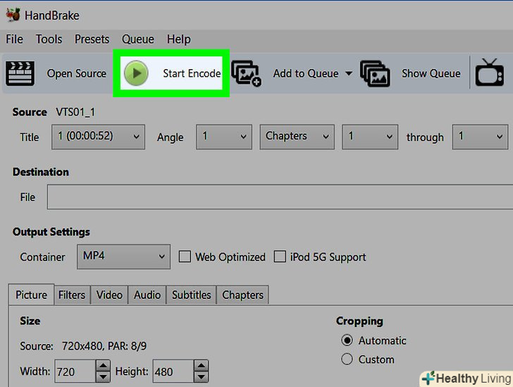 Клацніть по < span class="nowrap" title="This is not a clickable button; it illustrates the button one should find." style="font-family: Segoe UI, Frutiger, Frutiger Linotype, Dejavu Sans, Helvetica Neue, Arial, sans-serif;letter-spacing:0px;padding:0em .6em; border:1px solid; border-color:#AAA #555 #555 #AAA; -moz-border-radius: 0px; -webkit-border-radius: 0px; border-radius: 0px; background-color: #F2F2F2; background-image: -moz-linear-gradient(top, #FCFCFC, #E0E0E0); background-image: -o-linear-gradient(top, #FCFCFC, #E0E0E0); background-image: - webkit-linear-gradient(top, # FCFCFC, #E0E0E0); background-image: linear-gradient(top, #FCFCFC, #E0E0E0);">Start Encode (запустити конвертацію).ви знайдете цю зелену кнопку у верхній частині вікна. Буде запущений процес перетворення VOB-файлу в формат MP4. Коли процес буде завершено, MP4-файл відобразиться в обраній вами папці.
