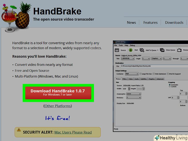 Перейдіть на сторінку завантаження HandBrake. її адреса: https://handbrake.fr/. HandBrake-це безкоштовна програма-конвертер файлів для Windows і Mac OS X.- HandBrake не підтримує Mac OS Sierra.