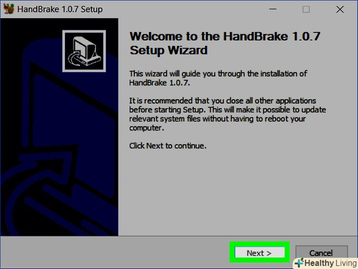 Натисніть < span class="nowrap" title="This is not a clickable button; it illustrates the button one should find." style="font-family: Segoe UI, Frutiger, Frutiger Linotype, Dejavu Sans, Helvetica Neue, Arial, sans-serif;letter-spacing:0px;padding:0em .6em; border:1px solid; border-color:#AAA #555 #555 #AAA; -moz-border-radius: 0px; -webkit-border-radius: 0px; border-radius: 0px; background-color: #F2F2F2; background-image: -moz-linear-gradient(top, #FCFCFC, #E0E0E0); background-image: -o-linear-gradient(top, #FCFCFC, #E0E0E0); background-image: - webkit-linear-gradient(top, # FCFCFC, #E0E0E0); background-image: linear-gradient(top, #FCFCFC, #E0E0E0);">Download HandBrake (завантажити). ви знайдете цю червону кнопку зліва на сторінці. Почнеться завантаження інсталяційного файлу HandBrake.- Можливо, спочатку вам доведеться підтвердити завантаження або вибрати папку для завантаження.