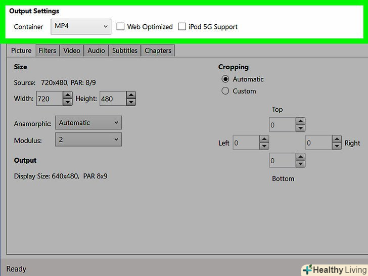 Змініть параметри конвертації (якщо необхідно).за замовчуванням HandBrake налаштований на оптимальне перетворення VOB-файлу в формат MP4. Проте рекомендуємо перевірити наступні параметри:- " file format "(Формат файлу): знайдіть розділ "Output Settings «(налаштування виводу) в центрі сторінки і переконайтеся, що в меню» Container «(Контейнер) обрана опція»MP4". Якщо ні, відкрийте це меню та натисніть на «MP4».