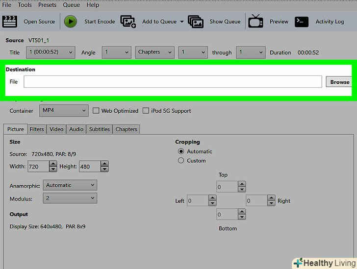 Натисніть < span class="nowrap" title="This is not a clickable button; it illustrates the button one should find." style="font-family: Segoe UI, Frutiger, Frutiger Linotype, Dejavu Sans, Helvetica Neue, Arial, sans-serif;letter-spacing:0px;padding:0em .6em; border:1px solid; border-color:#AAA #555 #555 #AAA; -moz-border-radius: 0px; -webkit-border-radius: 0px; border-radius: 0px; background-color: #F2F2F2; background-image: -moz-linear-gradient(top, #FCFCFC, #E0E0E0); background-image: -o-linear-gradient(top, #FCFCFC, #E0E0E0); background-image:-webkit-linear-gradient(top, #FCFCFC, #E0E0E0); background-image: linear-gradient(top, #FCFCFC, #E0E0E0);">Browse (огляд) праворуч від опції «File Destination» (місце призначення файлу).виберіть місце призначення, де буде створено новий відеофайл.