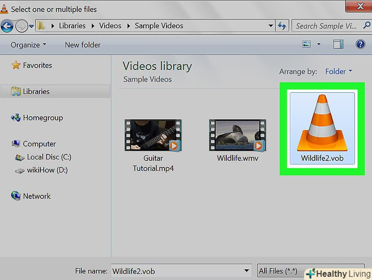 Виберіть потрібний VTS-файл у відповідній папці, а потім натиснітьВідкрити.- Відеофайли формату VTS зберігаються, як правило, в папці "VIDEO_TS" на DVD-диску і мають розширення .VOB.
