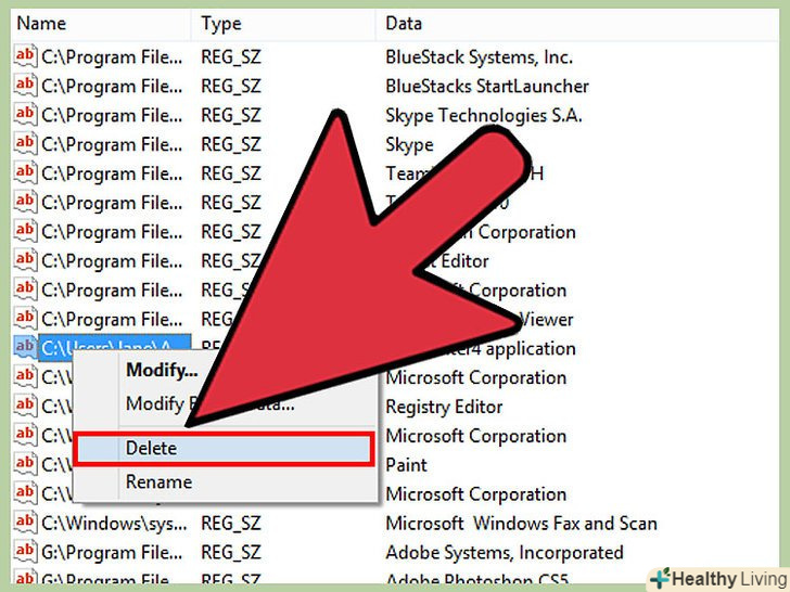 Натисніть правою кнопкою по знайденої в реєстрі записи і виберіть "Видалити". так ви видалите одну із записів регістра.