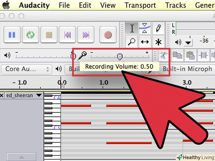 Перевірте рівні. встановіть Audacity в режим Record Ready, натискаючи на Pause (дві вертикальні сині лінії), потім, натискаючи на Record (червона точка). Програйте файл MIDI, і в Audacity, встановіть рівень входу (повзунок поруч з мікрофоном) так, щоб індикатори рівня дуже рідко доходили до 0.