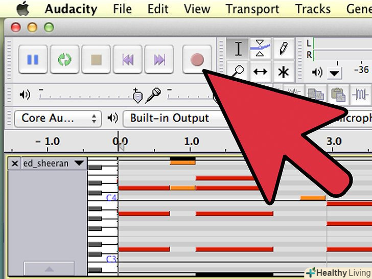 Запишіть вашу музику.коли будете задоволені виставленими рівнями, прокрутіть файл MIDI на початок, натисніть кнопку Record, далі, натисніть кнопку Play для файлу MIDI. Ви повинні побачити аудіо хвилі в треку Audacity.