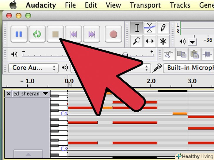 Зупиніть запис. коли пісня закінчиться, натисніть жовту кнопку Stop в Audacity, і потім клікніть на кнопку Stop в програмі для програвання MIDI.