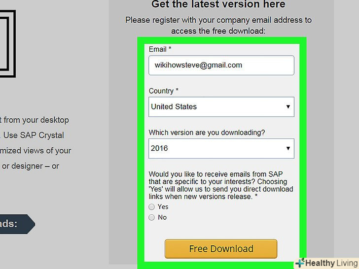 Скачайте архів з інсталяційним файлом.- Спочатку введіть деякі дані (ім'я, країну, версію і параметри розсилки), а потім натисніть «Free Download» (Завантажити безкоштовно).