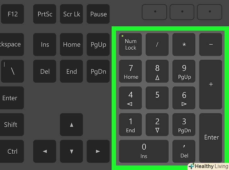 Переконайтеся, що на клавіатурі є цифрова клавіатура (панель). якщо праворуч на клавіатурі немає панелі з клавішами з цифрами (на додаток до клавіш з цифрами у верхній частині клавіатури), ви не зможете використовувати цей метод.- Але можна користуватися поєднаннями клавіш, які перераховані на попередньому кроці.