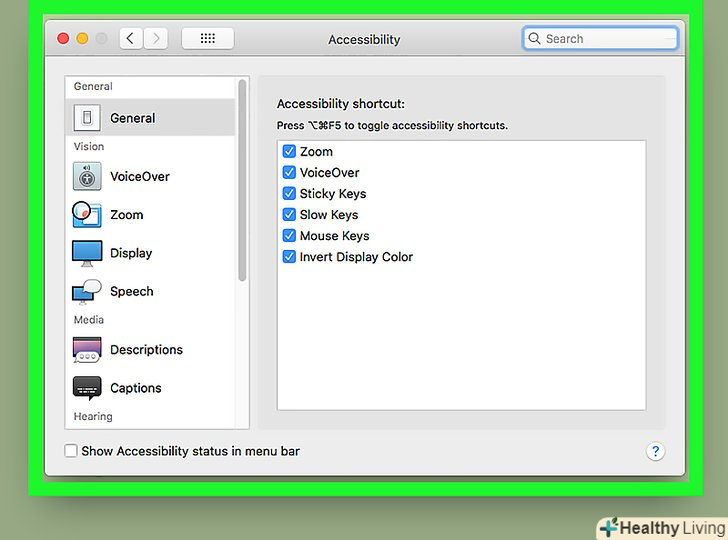 Відкрийте вікно "Параметри універсального доступу". залежно від моделі Комп'ютера Mac використовуйте одне з наступних поєднань клавіш:[3]- MacBook з Touch ID: швидко натисніть на Touch ID три рази;