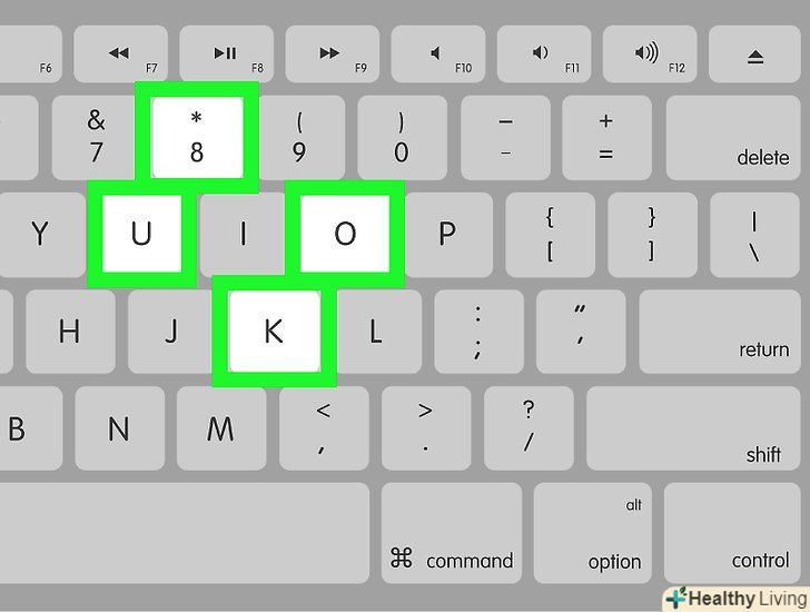 Перемістіть вказівник миші. за допомогою клавіш U, 8, O і K Покажчик можна перемістити вліво, вгору, вправо або вниз, відповідно.- Натисніть клавішуJ, 7, 9 або L, щоб перемістити покажчик по діагоналі (під кутом 45°) вниз вліво, вгору вліво, вгору вправо або вниз вправо, відповідно.