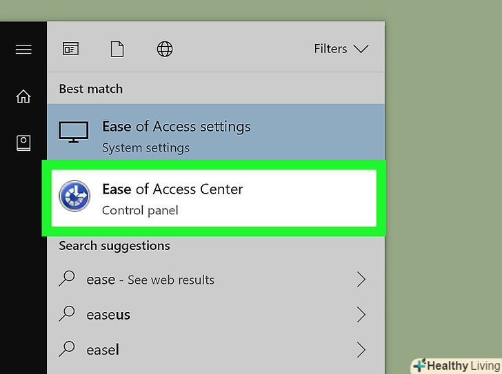 ВиберітьЦентр спеціальних можливостей. Використовуйте клавіші зі стрілками, щоб вибрати цю опцію у верхній частині меню «Пуск», а потім натисніть ↵ Enter. Відкриється Центр спеціальних можливостей.
