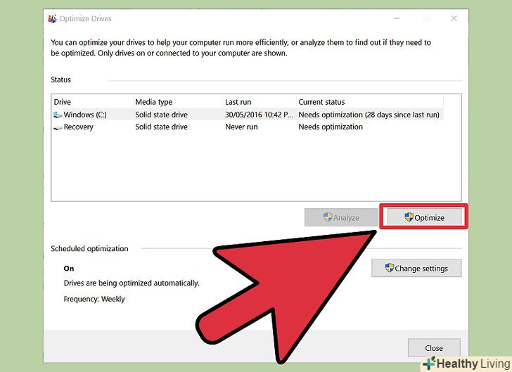 - Для запуску процесу дефрагментації натисніть "оптимізувати". Рекомендується не користуватися комп'ютером під час дефрагментації диска.[13]