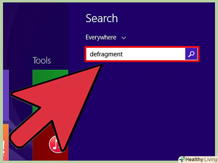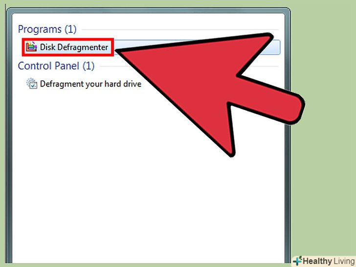 Дефрагментуйте жорсткий диск.з часом, коли ви записуєте і видаляєте безліч файлів, їх компоненти починають зберігатися на жорсткому диску в несуміжних кластерах, тобто системі доводиться звертатися до розрізнених кластерів, щоб знайти конкретний файл, а це зменшує загальну швидкодію ноутбука. У Windows дефрагментація диска виконується автоматично відповідно до заданого розкладом, але процес дефрагментації можна також запустити вручну.[20]- Натисніть "Пуск «і в рядку пошуку введіть» дефрагментація" (без лапок).