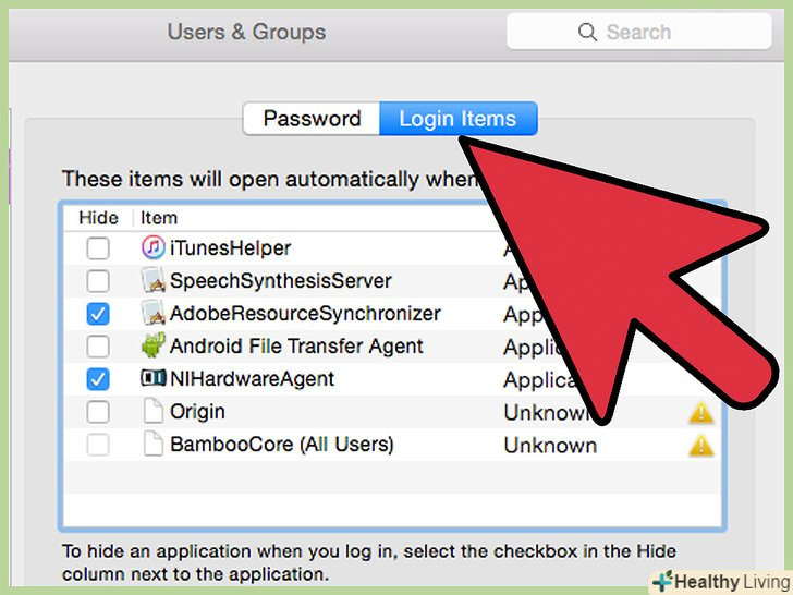 Обмежте кількість програм, які завантажуються автоматично.відкрийте меню Apple (у верхньому лівому куті екрана) і натисніть «Системні налаштування». Потім натисніть "користувачі і групи» - "автозавантаження". Поставте прапорець біля кожної програми, яка не повинна запускатися автоматично, і натисніть кнопку« -», щоб видалити вибрані програми зі списку. зменшення числа програм, які запускаються при завантаженні системи, дозволить збільшити продуктивність ноутбука.[5]