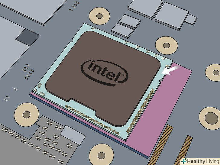 Встановіть процесор (CPU).навколо сокета, в який встановлюється процесор, може бути замок. Можливо, вам доведеться використовувати плоску викрутку, щоб його розблокувати.- Поверніть ваш процесор, поки не знайдете один з чотирьох кутів процесора, на якому не буде кутового штифта. Там буде насічка, яка буде збігатися з насічкою на сокеті.