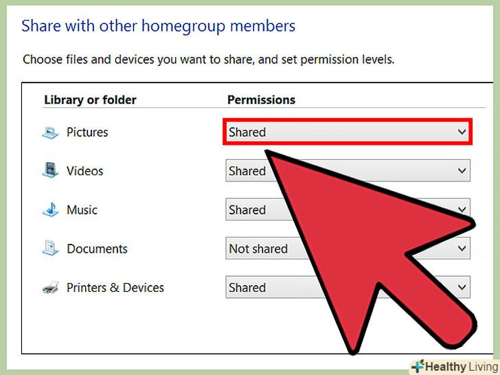 Позначте типи файлів, якими ви хочете поділитися з іншими комп'ютерами.можна вибрати наступні опції:» зображення«,» документи«,» музика«,» принтери «і»Відео". Поставте прапорці у потрібних типів файлів і приберіть прапорці у непотрібних.