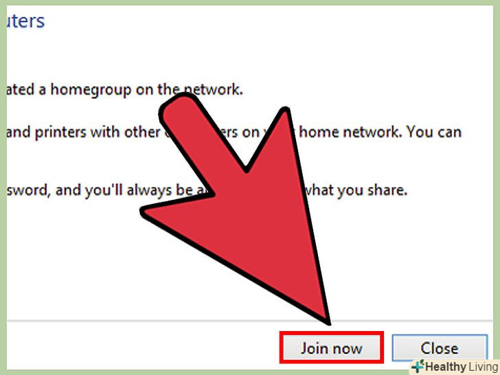 На другому комп'ютері у вікні "Домашня група" відобразиться нова Домашня група. Не створюйте нову групу-підключіться до існуючої групи і введіть пароль (при появі відповідного запиту). Тепер можна обмінюватися файлами між двома комп'ютерами.