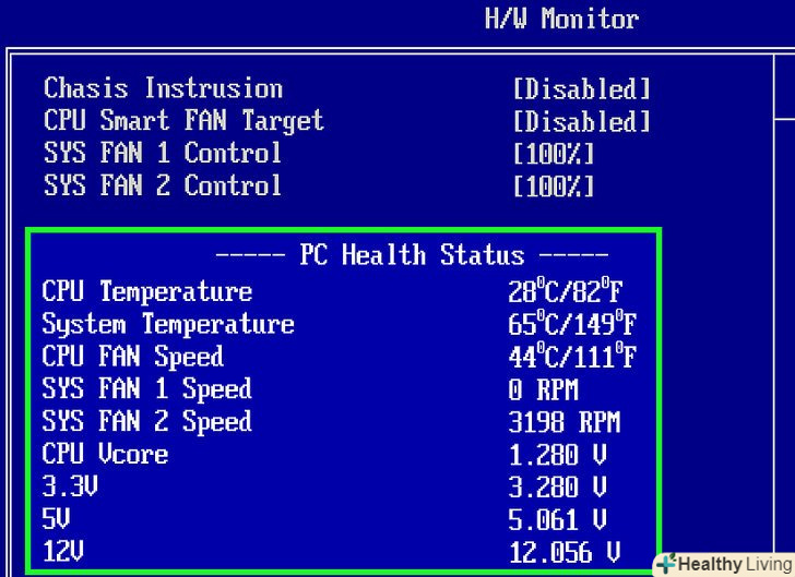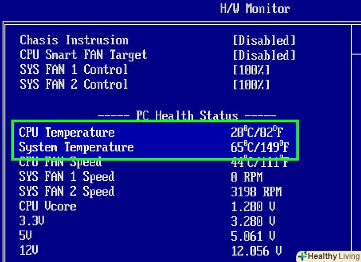 Знайдіть показання температури.кожна версія BIOS різна, але всі вони мають подібні характеристики. Ви знайдете показання температури в меню Monitor, Health Status, System Health, Sensor і т. п. Знайдіть показання температури.кожна версія BIOS різна, але всі вони мають подібні характеристики. Ви знайдете показання температури в меню Monitor, Health Status, System Health, Sensor і т. п.