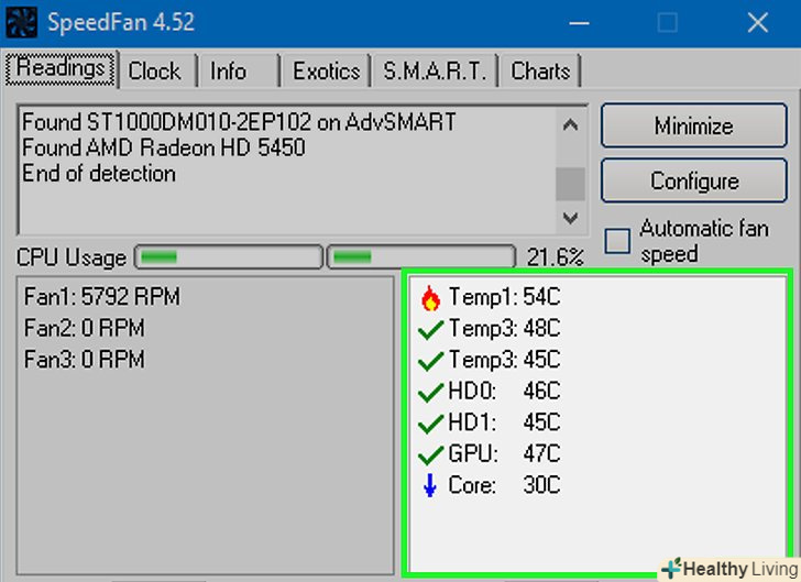 Перевірте температуру.запустіть SpeedFan або будь-яку іншу аналогічну програму. SpeedFan відобразить список температур у правій частині екрана. Температури наводяться в градусах Цельсія. Перевірте температуру.запустіть SpeedFan або будь-яку іншу аналогічну програму. SpeedFan відобразить список температур у правій частині екрана. Температури наводяться в градусах Цельсія.- GPU-температура відеокарти. Використання ресурсомістких графічних програм, таких як 3D-Ігри та відео високої чіткості, викличе зростання температури відеокарти.