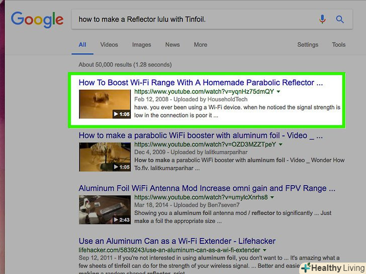 Зробіть Саморобний відбивач сигналу з фольги.посилити сигнал можна за допомогою відбивача з фольги, при цьому сигнал стає більш спрямованим.- Виріжте коло з фольги і закріпіть його на відрізку з щільного паперу або картону достатнього розміру, щоб покрити роутер. Для більш естетичного вигляду можна вирізати параболу з отвором для антени в точці фокуса.