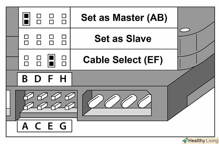 Встановіть жорсткий диск з налаштуванням Master (або Master/No Slave, якщо така є).ця перемичка знаходиться між роз'ємом живлення Molex (4 великих круглих штиря) і роз'ємом ATA/SATA. Ви побачите 2 ряди з чотирьох або п'яти невеликих штифтів і невеликий затиск (перемичку), з'єднаний з 2-я з них. Витягніть перемичку за допомогою такого інструменту, як пінцет або олівець і помістіть його в положення Master, якщо він там ще не знаходиться. Схема різних перемичок, як правило, знаходиться прямо на верхній мітці жорсткого диска.