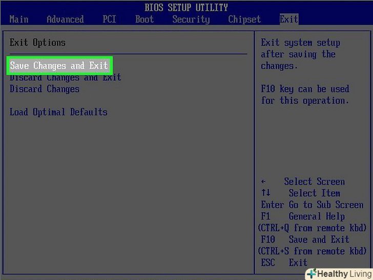 Збережіть внесені зміни і вийдіть з BIOS.для цього виберіть опцію» Save and Exit " (Зберегти і вийти). Після цього комп'ютер буде перезавантажений, а внесені зміни вступлять в силу.- З'ясуйте (у списку клавіш у нижній частині екрана), яка клавіша відповідає опції «Зберегти і вийти».