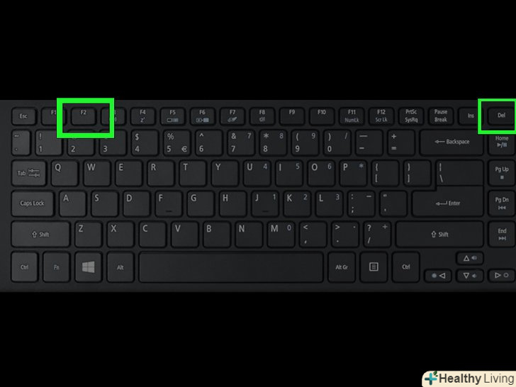 Затисніть клавішуDel або F2, щоб увійти в BIOS.можливо, на вашому комп'ютері потрібно натиснути іншу клавішу.- Як правило, потрібно натиснути одну з F-клавіш, щоб увійти в BIOS. F-клавіші знаходяться у верхній частині клавіатури. Можливо, на вашому комп'ютері спочатку потрібно затиснути клавішуFn, а потім натиснути одну з F-клавіш.