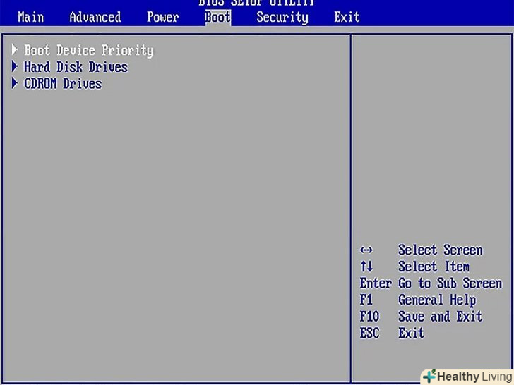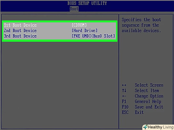 Змініть порядок завантаження. щоб змінити первинний завантажувальний пристрій, перейдіть на вкладку Boot (Завантаження). Тут можна вказати, з якого пристрою буде завантажуватися комп'ютер. Скористайтеся цим, щоб завантажити комп'ютер з компакт-диска або флеш-накопичувача, якщо необхідно встановити або відновити операційну систему.- Перейти на вкладку "Завантаження" можна за допомогою клавіш зі стрілками.