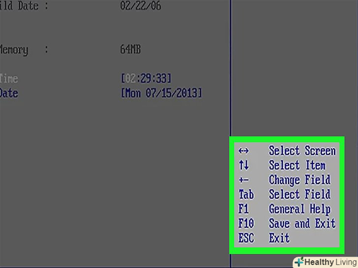 Ознайомтеся з елементами керування BIOS.Запам'ятайте: в деяких версіях BIOS мишею користуватися не можна, тому по опціях BIOS переміщаються за допомогою клавіш зі стрілками та інших клавіш. Як правило, в правому нижньому кутку екрану відображається список клавіш і їх призначення.- Змініть налаштування. Вносьте зміни тільки в ті Налаштування, призначення яких вам відомо; в іншому випадку ваші дії можуть привести до непрацездатності комп'ютера.