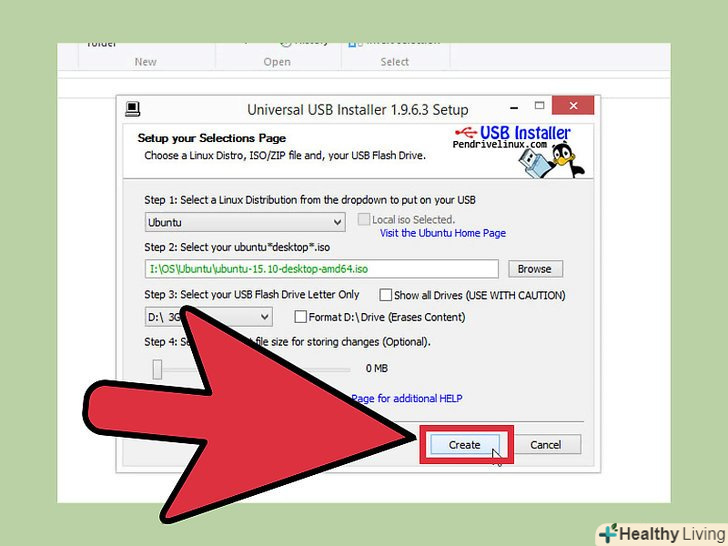 Натисніть "Create" (створити).USB-накопичувач буде відформатований, перетворений в завантажувальний диск і на нього скопіюються файли Ubuntu.[1]