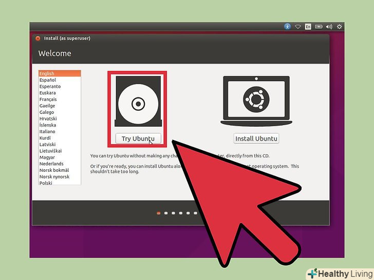 Перед установкою протестуйте Ubuntu (якщо хочете).під час першого завантаження з USB-накопичувача відкриється екран привітання. Виберіть мову інтерфейсу, а потім або протестуйте роботу Ubuntu, або відразу встановіть цю систему. Під час тестування Ubuntu ви отримаєте доступ до всіх функцій цієї системи (але без можливості зберегти внесені зміни). Ubuntu можна встановити в будь – який момент-для цього клацніть по відповідному значку на робочому столі.