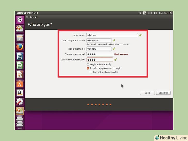 Створіть обліковий запис Користувача.введіть ім'я Користувача (без пробілів!) і пароль (він повинен бути одночасно надійним і легко запам'ятовується). Можна налаштувати автоматичний вхід в систему або Вхід після введення пароля.- Якщо хочете, поміняйте ім'я комп'ютера. Під цим ім'ям комп'ютер буде значитися при підключенні до мережі.