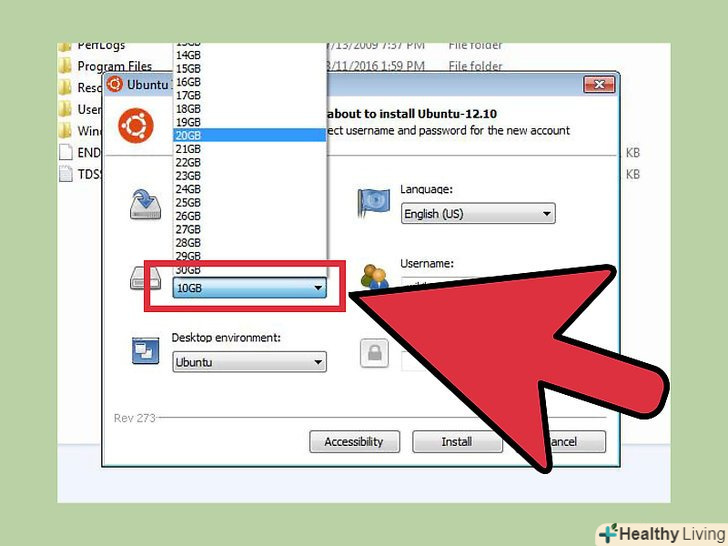 Задайте розмір розділу, на якому встановиться Ubuntu.при установці Ubuntu на основі порожнього простору жорсткого диска буде створено новий розділ. У випадаючому меню вкажіть його розмір. Для стабільної роботи Ubuntu потрібно як мінімум 7 ГБ або більше, якщо ви збираєтеся встановлювати програми і завантажувати файли.