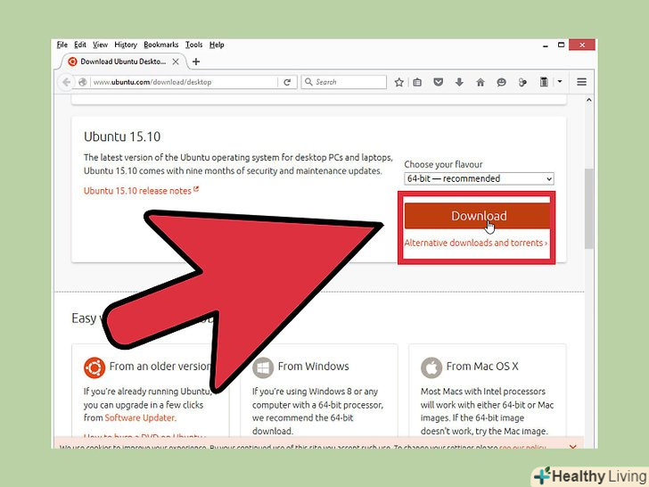 Натисніть "Download" (Завантажити) біля потрібної версії.як правило, пропонується завантажити дві версії: LTS (з тривалою технічною підтримкою) і саму останню стабільну версію. Більшості користувачів рекомендується завантажити Ubuntu LTS-ця версія дозволяє завантажувати оновлення протягом п'яти років. Остання стабільна версія зможе оновлюватися протягом дев'яти місяців, а потім її потрібно замінити новою версією.- Більшість сучасних комп'ютерів підтримує 64-розрядні версії операційних систем, включаючи Ubuntu. Якщо ви не знаєте розрядність операційної системи, прочитайте цю статтю.