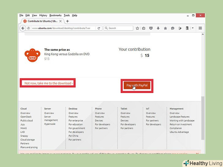 Пожертвуйте гроші розробникам Ubuntu або просто скачайте цю систему.спочатку вам запропонують пожертвувати деяку суму компанії Canonical (займається розробкою і підтримкою Ubuntu). Якщо ви не хочете надавати матеріальну підтримку, прокрутіть сторінку вниз і натисніть «Not now, take me to the download» (не зараз, перейти до скачування).