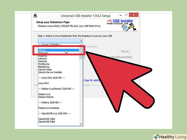 У першому випадаючому меню виберіть опцію "Ubuntu". програму Universal USB Installer можна використовувати для того, щоб створити завантажувальний USB-накопичувач з будь-яким дистрибутивом Linux. Тому виберіть опцію "Ubuntu", щоб правильно відформатувати накопичувач.