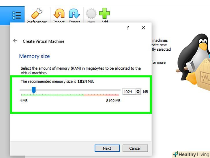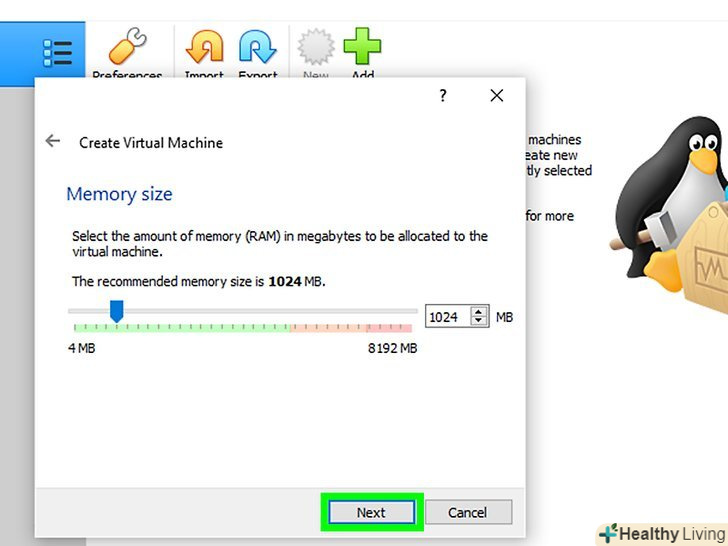 Вкажіть розмір оперативної пам'яті.перетягніть повзунок вліво або вправо, щоб зменшити або збільшити обсяг оперативної пам'яті, який буде використовуватися віртуальною машиною Ubuntu.- За замовчуванням буде обраний оптимальний обсяг оперативної пам'яті.