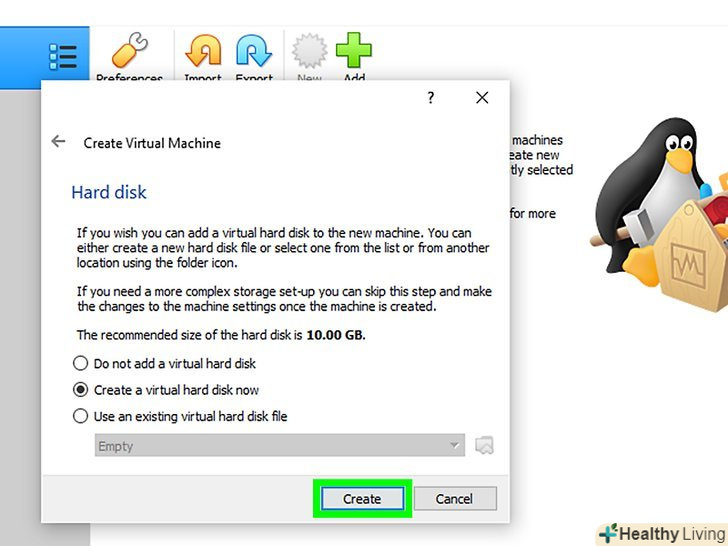 НатиснітьСтворити. це синій значок у верхньому лівому куті вікна VirtualBox. Відкриється спливаюче меню.