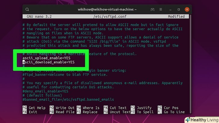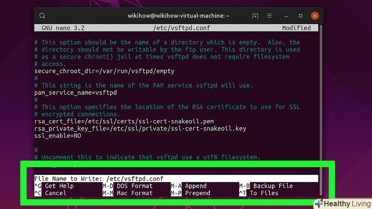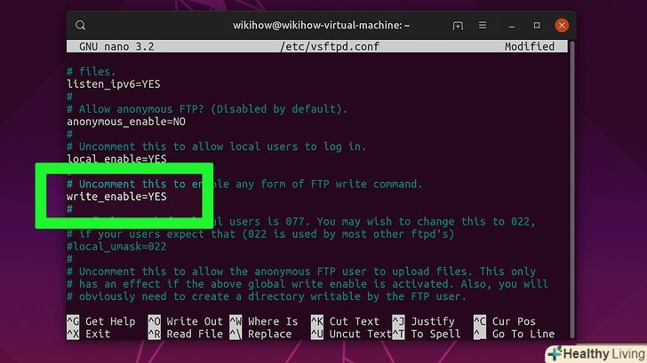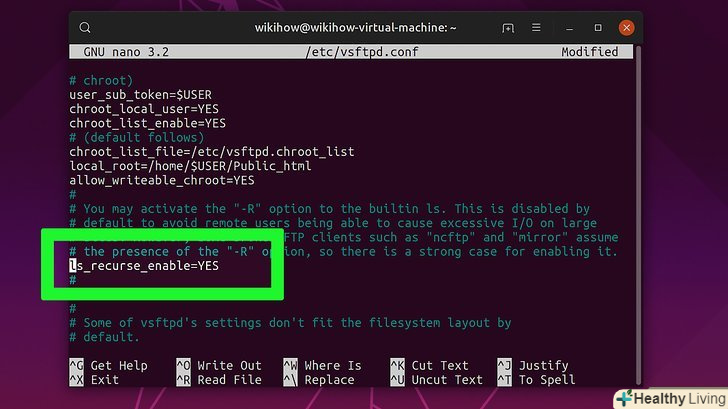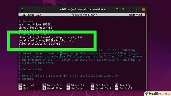 Chroot_list_file=/etc/vsftpd.chroot_listLocal_root=/home/$USER/Public_htmlAllow_writeable_chroot=YES- Якщо будь-яка з цих рядків вже існує, просто видаліть з них символ"#".