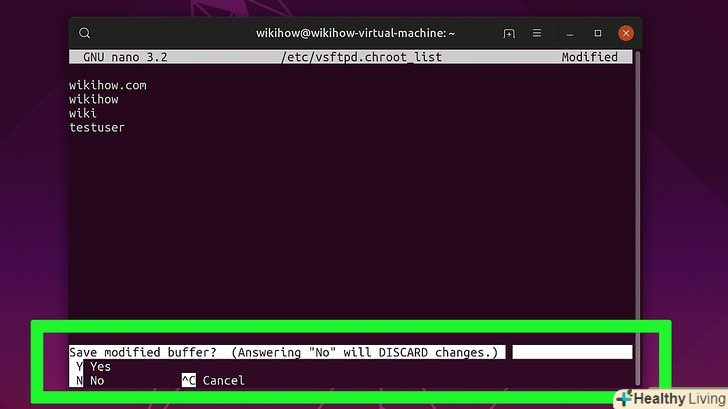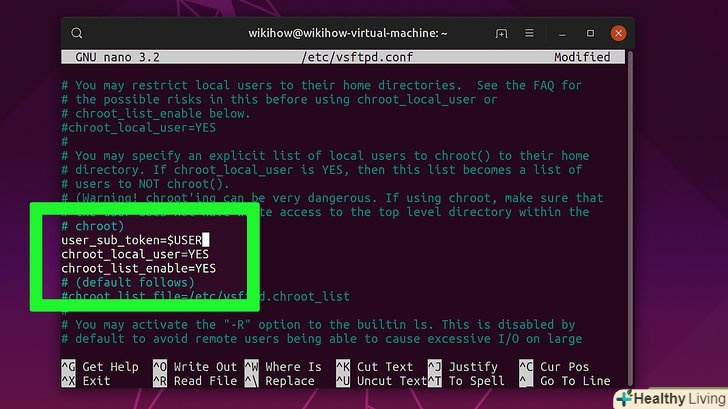 User_sub_token=$USERChroot_local_user=YESChroot_list_enable=YES- Якщо будь-яка з цих рядків вже існує, просто видаліть з них символ"#".